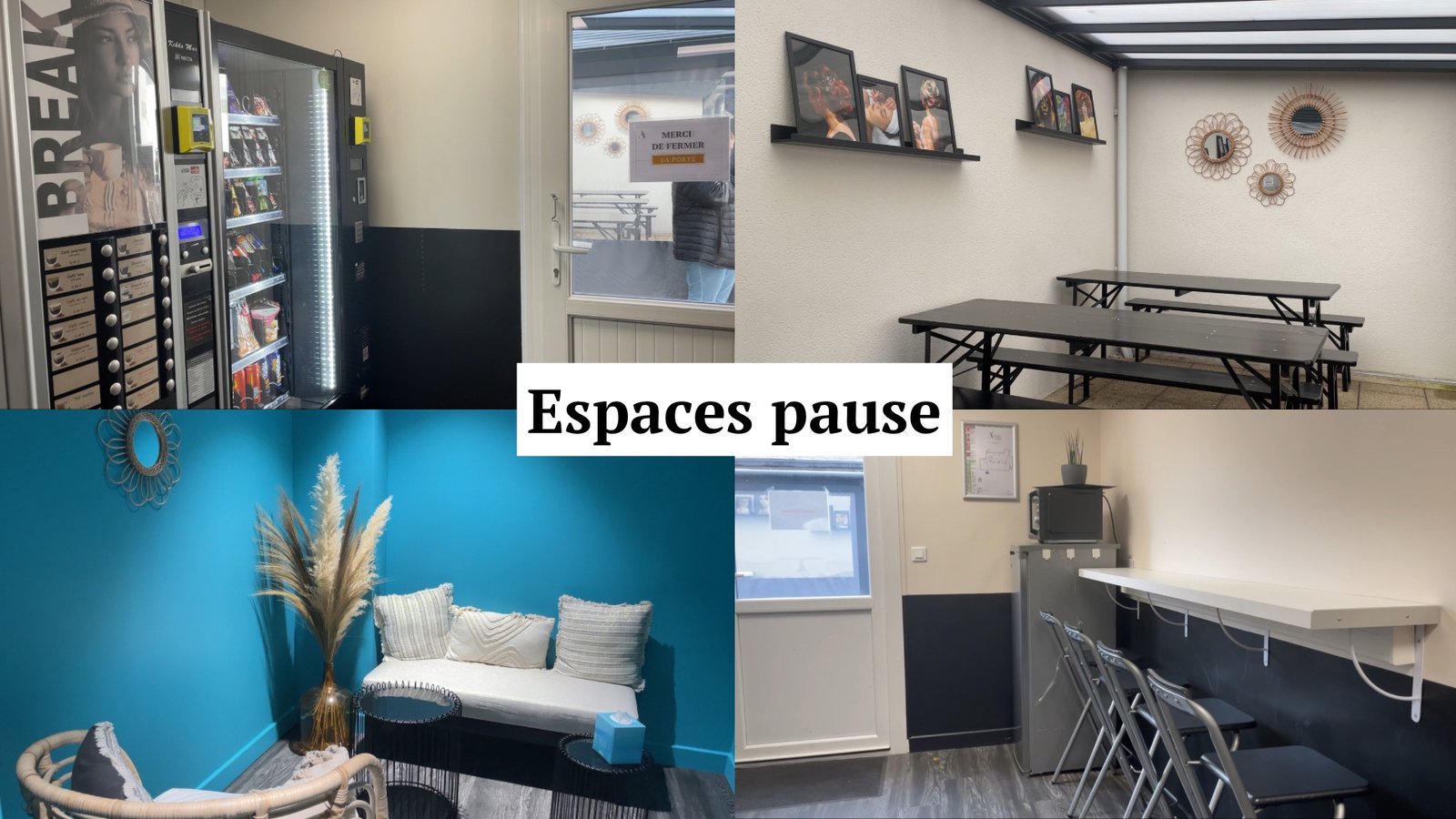 2 espaces cuisine : avec micro ondes, réfrigérateurs, distributeurs, évier, machines à café